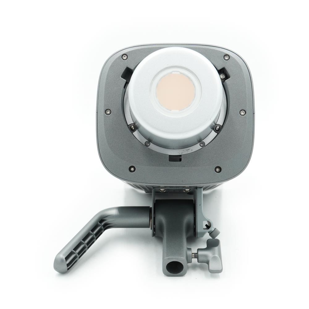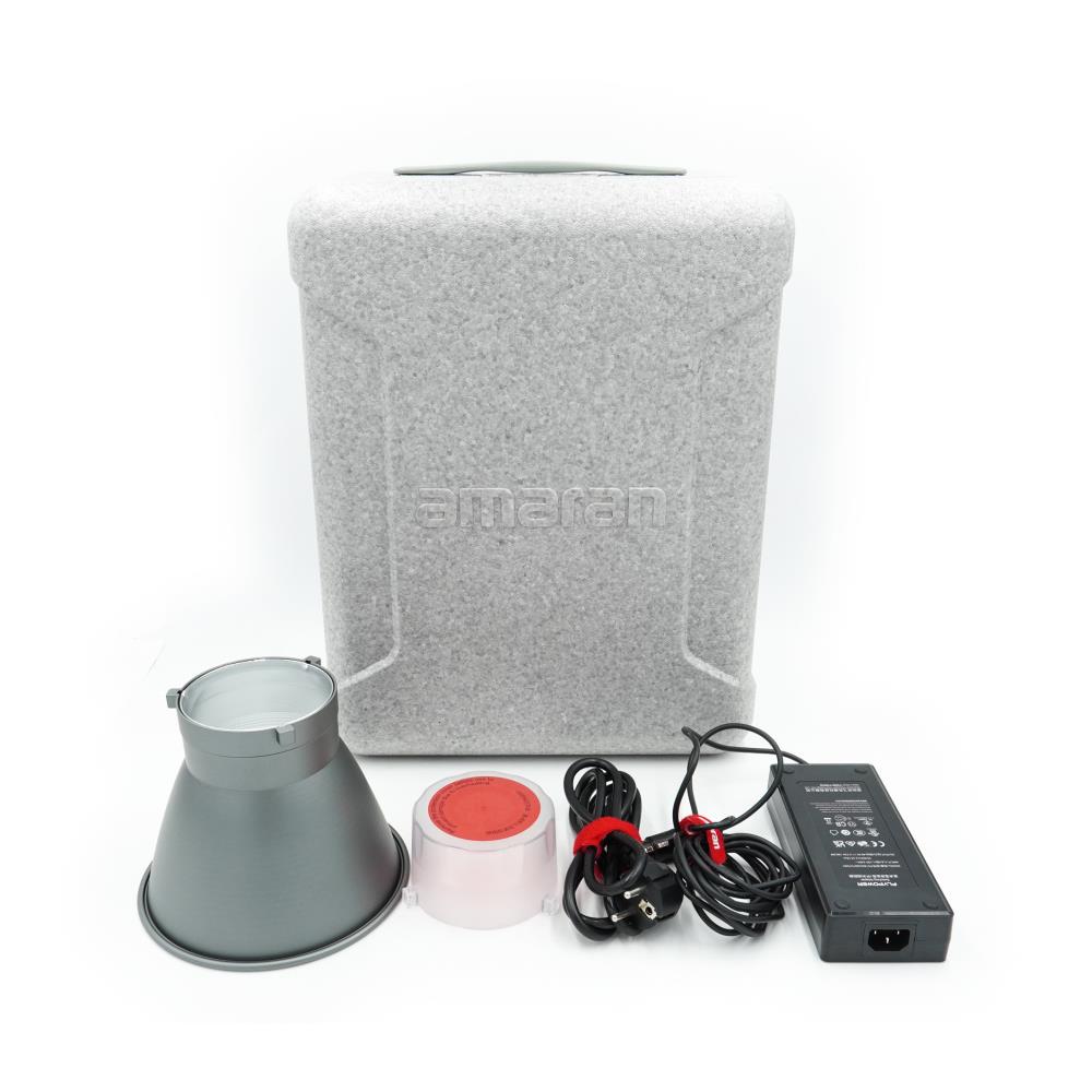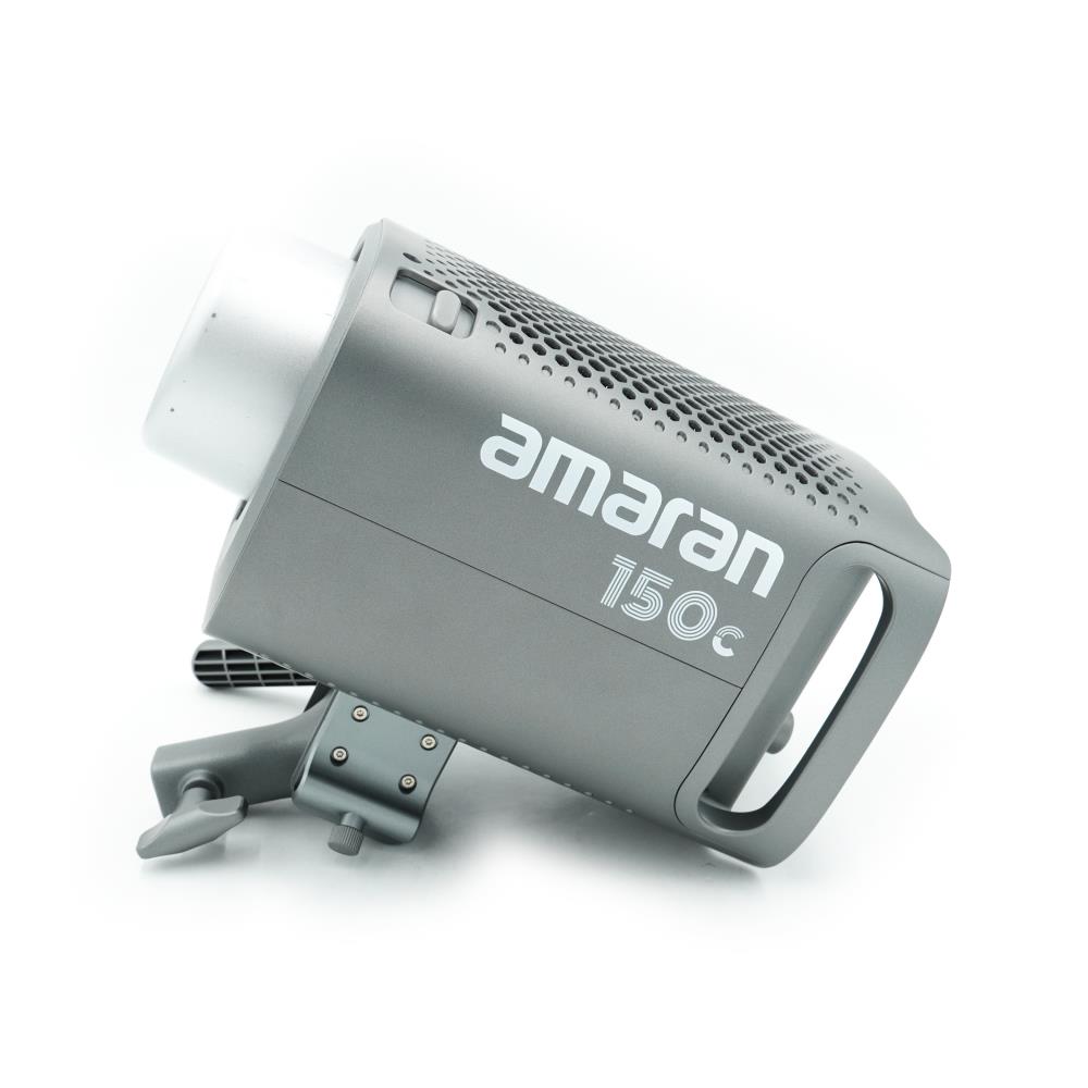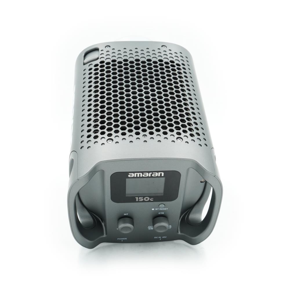 The Aputure Amaran 150c is a 150W point-source LED light that utilizes an RGBWW chipset to provide full color control and a variable color temperature range between 2,500K and 7,500K. The device integrates Aputure's proprietary color-blending technology to maintain consistent chromatic accuracy with nominal CRI and TLCI ratings of 95 or higher. The hardware design includes a universal Bowens Mount that allows for the installation of optical or diffusion modifiers and features an active cooling system for thermal management during extended use. Parameter control is achieved via the physical interface on the back of the lamp body or through the Bluetooth Mesh protocol using the Sidus Link application. Powered via a 48V DC connection, the fixture can be connected to the mains or compatible external batteries, providing a dimmable light output from 0% to 100% with various dimming curves integrated into the firmware.