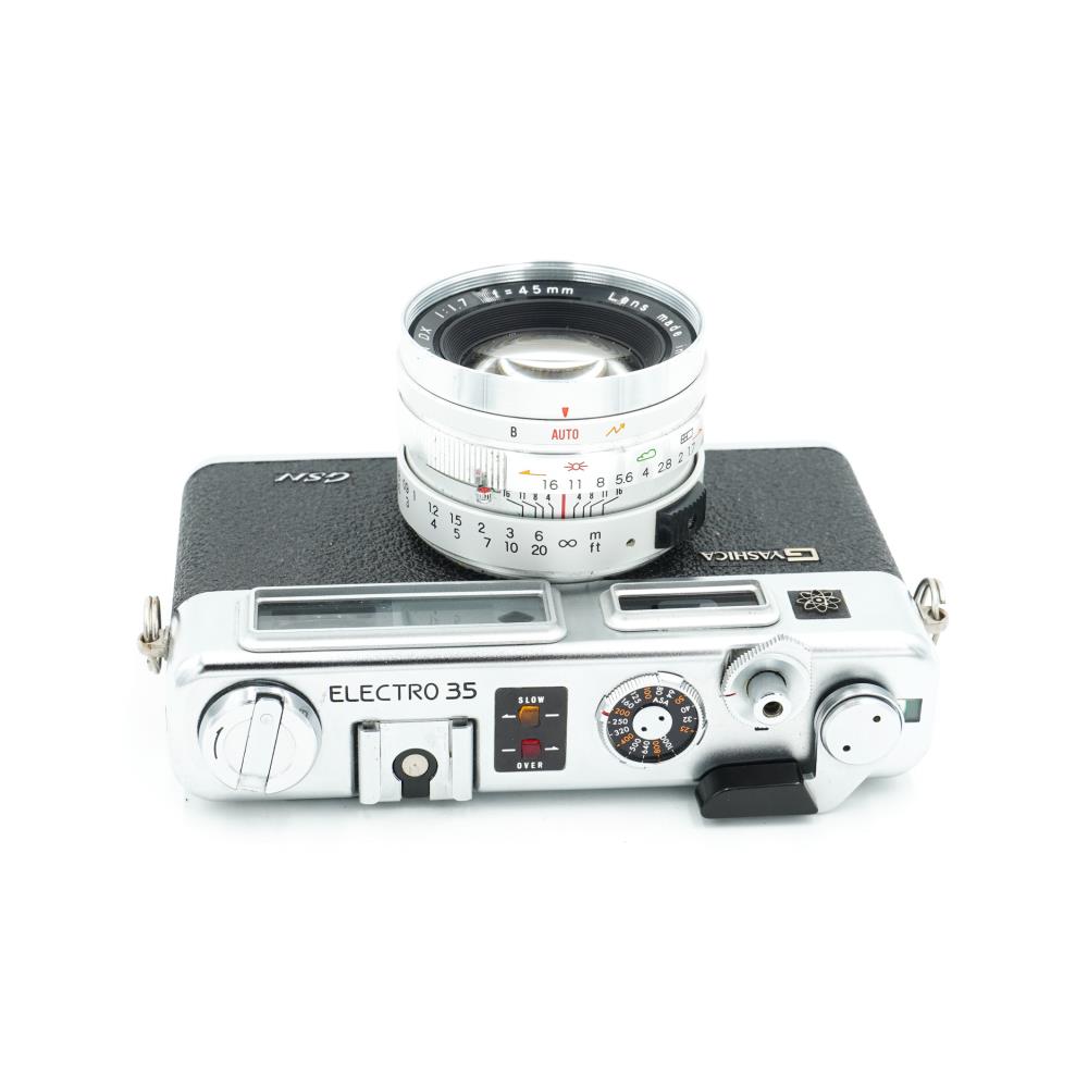 The Yashica Electro 35 GSN is a rangefinder camera produced in the 1970s, renowned for its solid build quality and the bright Yashinon 45mm f/1.7 lens. It features aperture-priority automatic exposure and an advanced electronic system for its time. The GSN version stands out for its black or chrome finish and its ability to connect a flash via hot-shoe and PC sync socket. Still today, it is highly valued by film photography enthusiasts for its retro style and sharp, character-rich images.