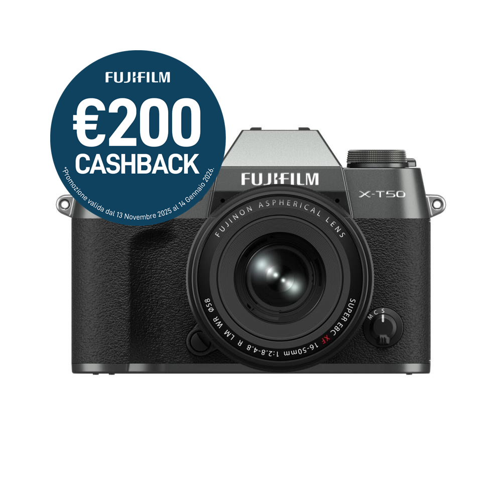 X-T50 è caratterizzata da un corpo compatto e leggero che pesa circa 438g e presenta il sensore X-Trans CMOS 5 HR retroilluminato da 40,2 megapixel, il motore di elaborazione delle immagini ad alta velocità “X-Processor 5”, e una funzione di stabilizzazione dell’immagine IBIS a 5 assi, fino a 7,0 stop. È un modello versatile che unisce elevate prestazioni e qualità dell’immagine a una grande portabilità. In combinazione con il nuovo obiettivo zoom standard FUJINON XF16-50mmF2.8-4.8 R LM WR può essere utilizzata per la ripresa di immagini in qualsiasi tipologia scatto. Inoltre, X-T50 è munita di ghiera per la selezione immediata delle “Simulazioni Pellicola”, una delle funzioni chiave che contraddistinguono FUJIFILM e che consente un’ampia varietà di tonalità di colore. X-T50 incorpora anche un nuovo design dalla forma arrotondata che garantisce al contempo un elevato grip e dimensioni compatte. Inoltre, le sue caratteristiche tecniche le permettono di offrire una qualità d’immagine eccezionale, per una esperienza fotografica ai massimi livelli.