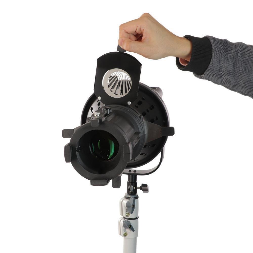 Phottix Pop One è uno Snoot dotato di Condensatore Ottico che consente di focheggiare e restringere il fascio luminoso a 40° con il supporto per gobos e gelatine, inclusi nel kit.