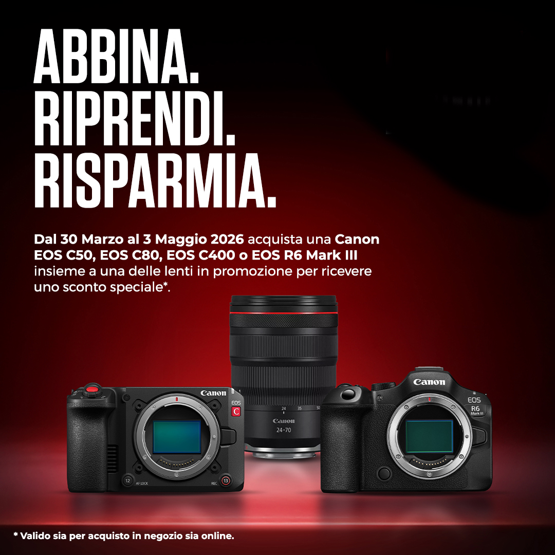 Acquista una delle videocamere Canon Cinema EOS (C50/C80/C400) o una fotocamera Canon EOS R6 Mark III in abbinata ad un'ottica Ibrida per RADDOPPIARE lo sconto cassa! La promozione è valida dal 30 Marzo al 19 Aprile 2026. Contattai in negozio per ottenere la promozione.