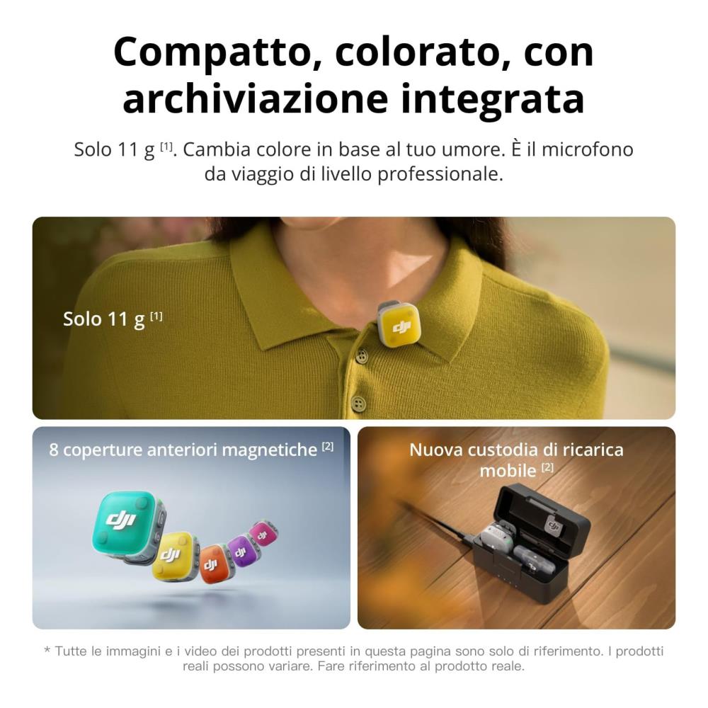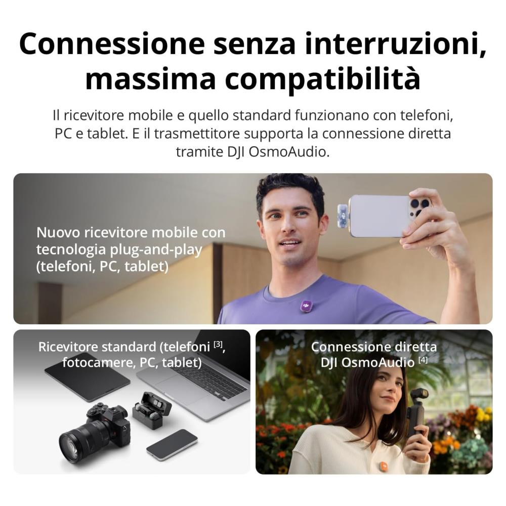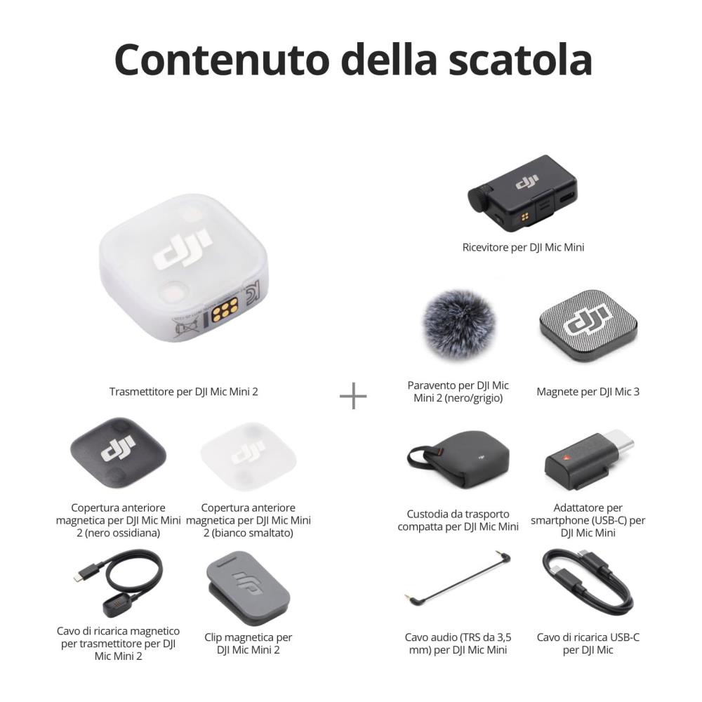 Il sistema DJI Mic Mini 2 nella configurazione completa con due trasmettitori, un ricevitore e custodia di ricarica, si distingue per un design ultraleggero dove ogni trasmettitore pesa circa 10 grammi, permettendo un fissaggio discreto tramite clip o magnete senza appesantire i tessuti. Il ricevitore è progettato per una connettività universale, integrando connettori intercambiabili USB-C e Lightning per dispositivi mobili, oltre a un'uscita TRS da 3,5 mm per fotocamere reflex e mirrorless. Dal punto di vista dell'acquisizione, il sistema supporta audio digitale a 48 kHz e 24 bit con una pressione sonora massima di 120 dB, garantendo riprese pulite anche in ambienti rumorosi grazie alla funzione di cancellazione del rumore a due livelli. La tecnologia di trasmissione digitale a 2.4 GHz assicura una portata massima di 400 metri (FCC) o 200 metri (CE) in campo aperto senza interferenze, mantenendo una latenza estremamente ridotta. L'autonomia del sistema è ottimizzata dalla custodia di ricarica che garantisce fino a 48 ore di utilizzo totale, con i singoli trasmettitori capaci di operare per circa 11,5 ore con una singola carica. Il sistema supporta inoltre il collegamento diretto tramite Bluetooth a smartphone o action cam DJI compatibili e include la funzione di Safety Track, che registra una traccia secondaria a -6 dB per prevenire distorsioni improvvise del segnale, rendendolo uno strumento affidabile per la produzione di contenuti professionali.