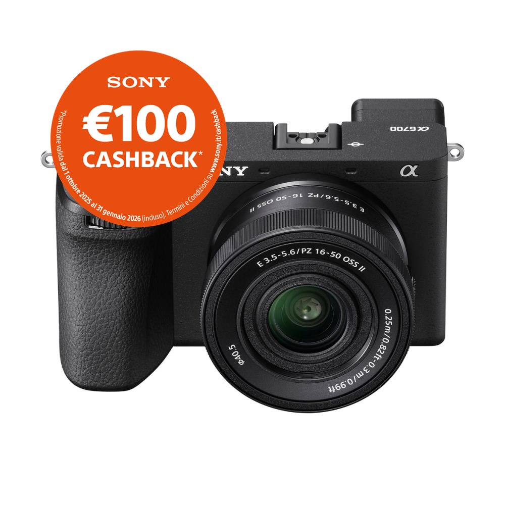 Cattura l'azione in condizioni di scarsa luminosità con il sensore Exmor R da 26 MP e il processore BionZ XR. Crea immagini realistiche o esprimi il tuo stile personale con i preset regolabili. Non lasciarti sfuggire il momento perfetto da immortalare con lo scatto continuo rapido fino a 11 fps e un'ampia gamma di obiettivi APS-C Sony nativi. È davvero facile mettere a fuoco i tuoi soggetti con l'autofocus basato sull'intelligenza artificiale. L'unità di elaborazione AI dedicata garantisce un rilevamento rapido e preciso. Analizza la posa dei soggetti e passa facilmente da un soggetto a un altro. Passa al DMF costante ed esplora il bracketing della messa a fuoco per fotografie ad alta risoluzione. Sony a 6700 eredita le migliori funzionalità delle nostre videocamere Cinema Line, con riprese in qualità 4K con sovracampionamento 6K fino a 30p (10 bit, 4:2:2) e slow motion 4K fino a 120p. Con stabilizzazione attiva, profilo S-Cinetone/S-Log3 e Auto Framing basato sull'intelligenza artificiale, è lo strumento perfetto per riprese cinematografiche in movimento. Goditi la stabilità in qualsiasi situazione e funzionalità professionali quali la compensazione del breathing, l'anteprima LUT e il menu Fn video rapido. Progettata per le tue avventure, a 6700 è compatta e leggera. Goditi uno schermo touch orientabile, un mirino elettronico nitido e una ghiera frontale aggiuntiva per riprese e scatti intuitivi. Con la resistenza a polvere e umidità e la scocca in lega di magnesio, mettila alla prova in qualsiasi ambiente. Non porre limiti alla tua creatività con a 6700. Scopri una qualità d'immagine eccezionale e uno splendido effetto bokeh con l'ampia gamma di obiettivi. Connettila allo smartphone tramite Creators' App per trasferire facilmente le tue immagini. Trasforma la fotocamera in una webcam 4K di alta qualità per riunioni online e streaming. Usufruisci della piattaforma Creators' Cloud di Sony per la produzione collaborativa.